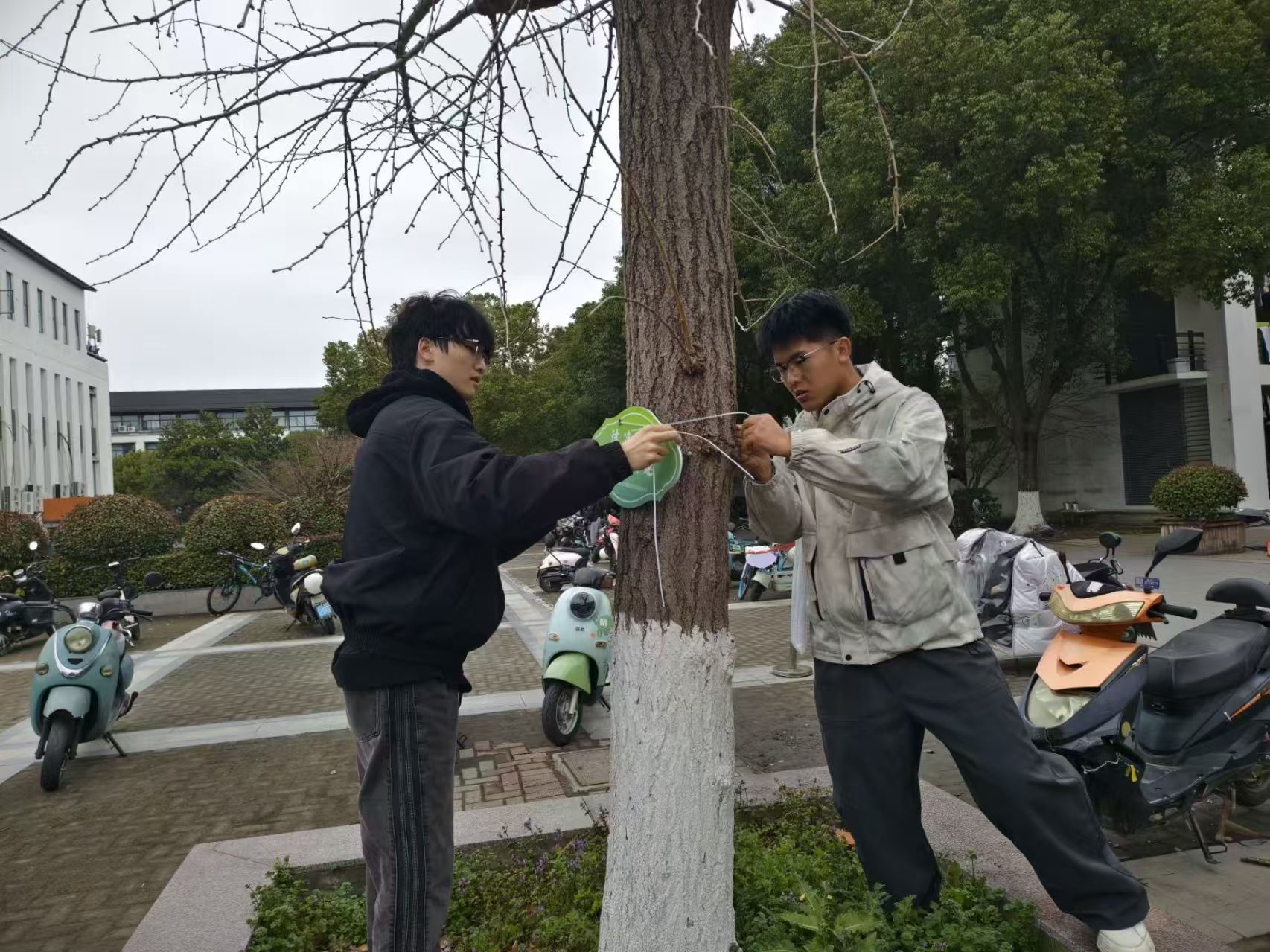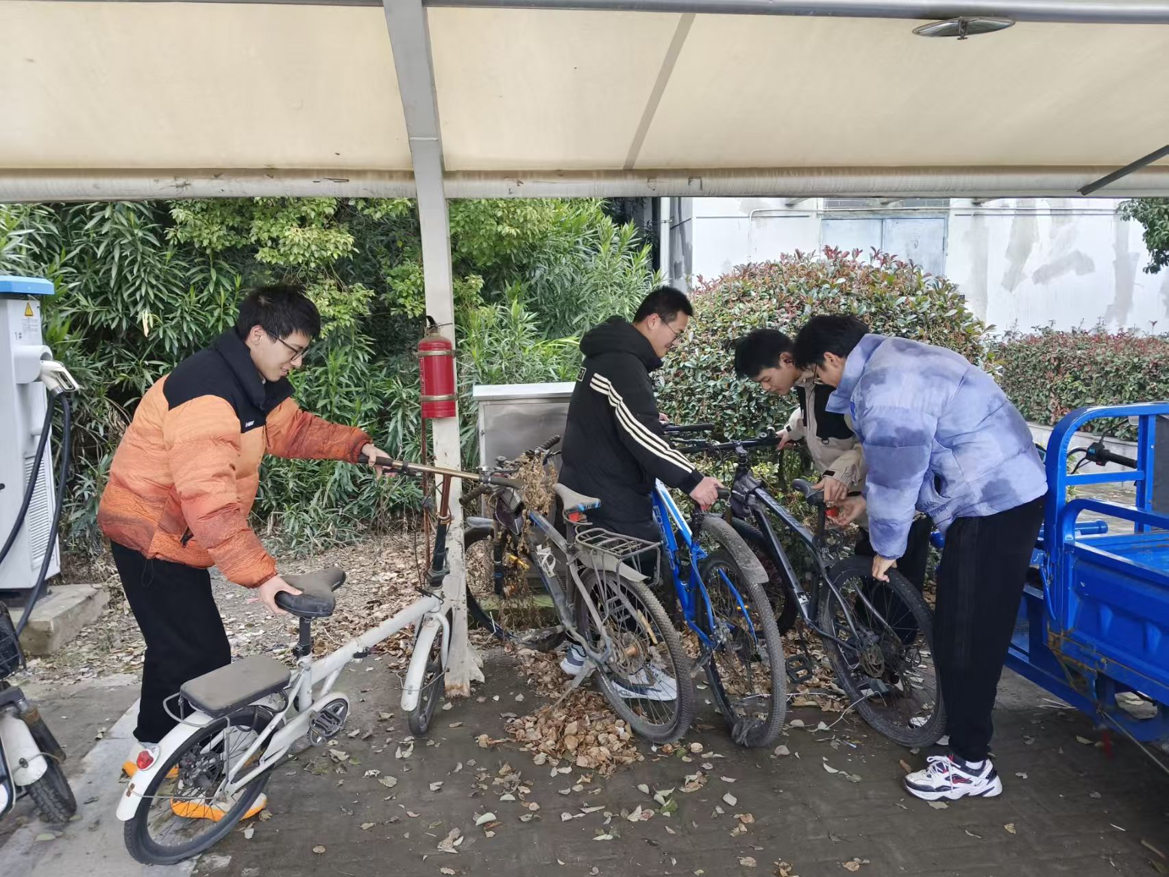 整理有序摆放单车:针对校园内乱停乱放的单车,志愿者们将车辆搬运至指定停放区,摆放整齐,并清理周边杂物,确保道路畅通。同时,志愿者在停放点引导同学规范停车。